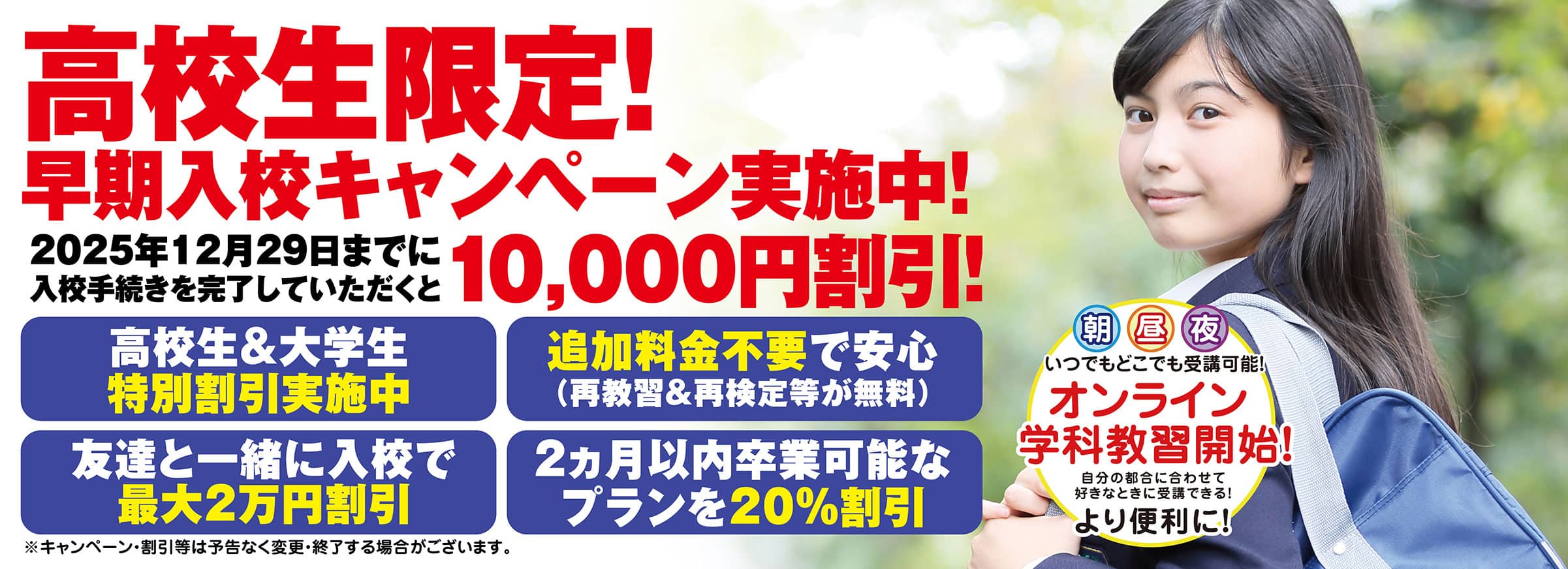 さらに割引がありますので是非お誘い合わせのうえご来校ください!